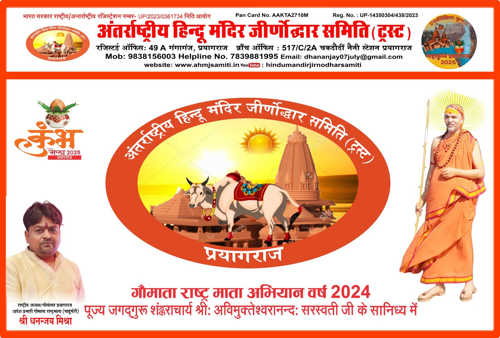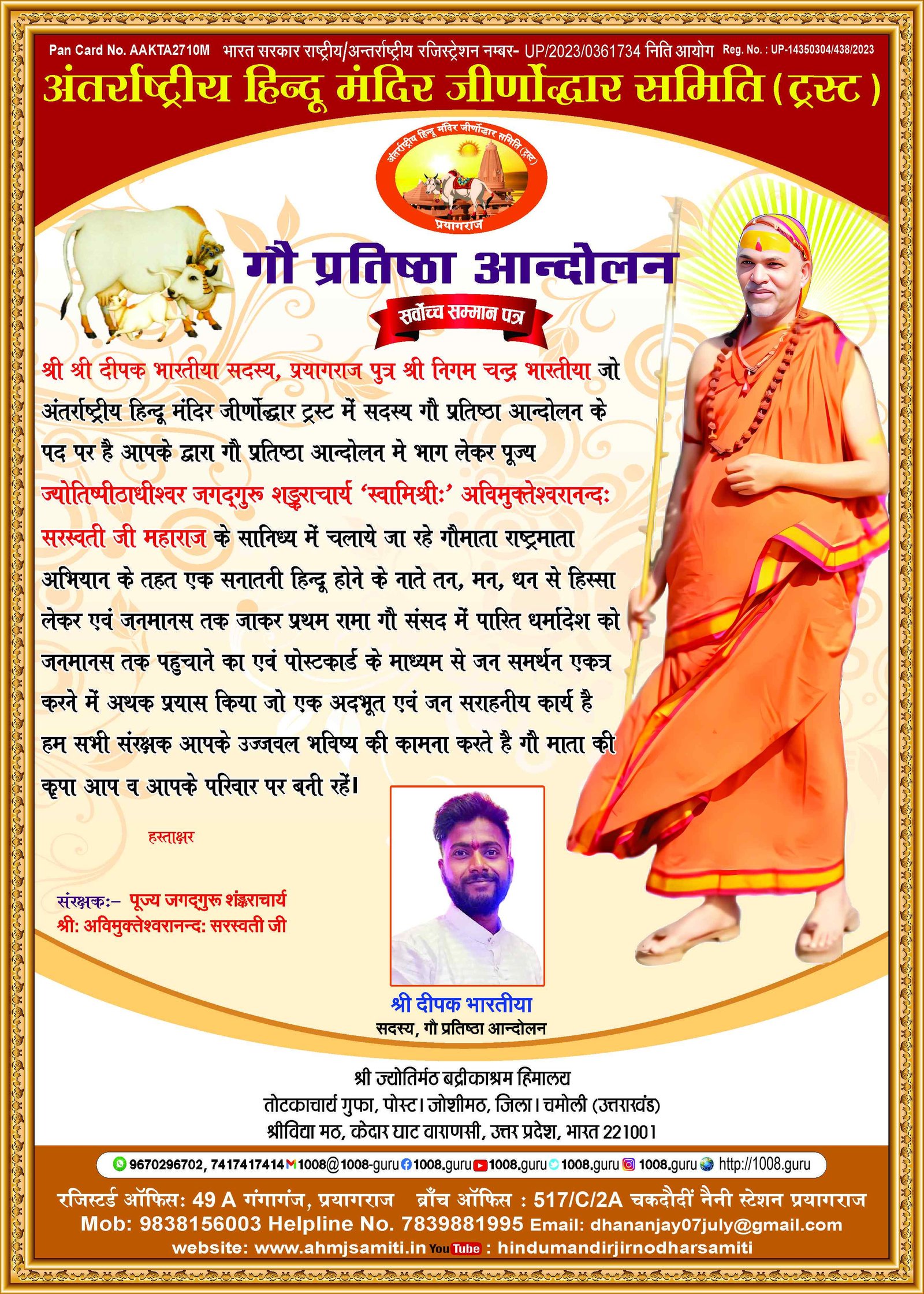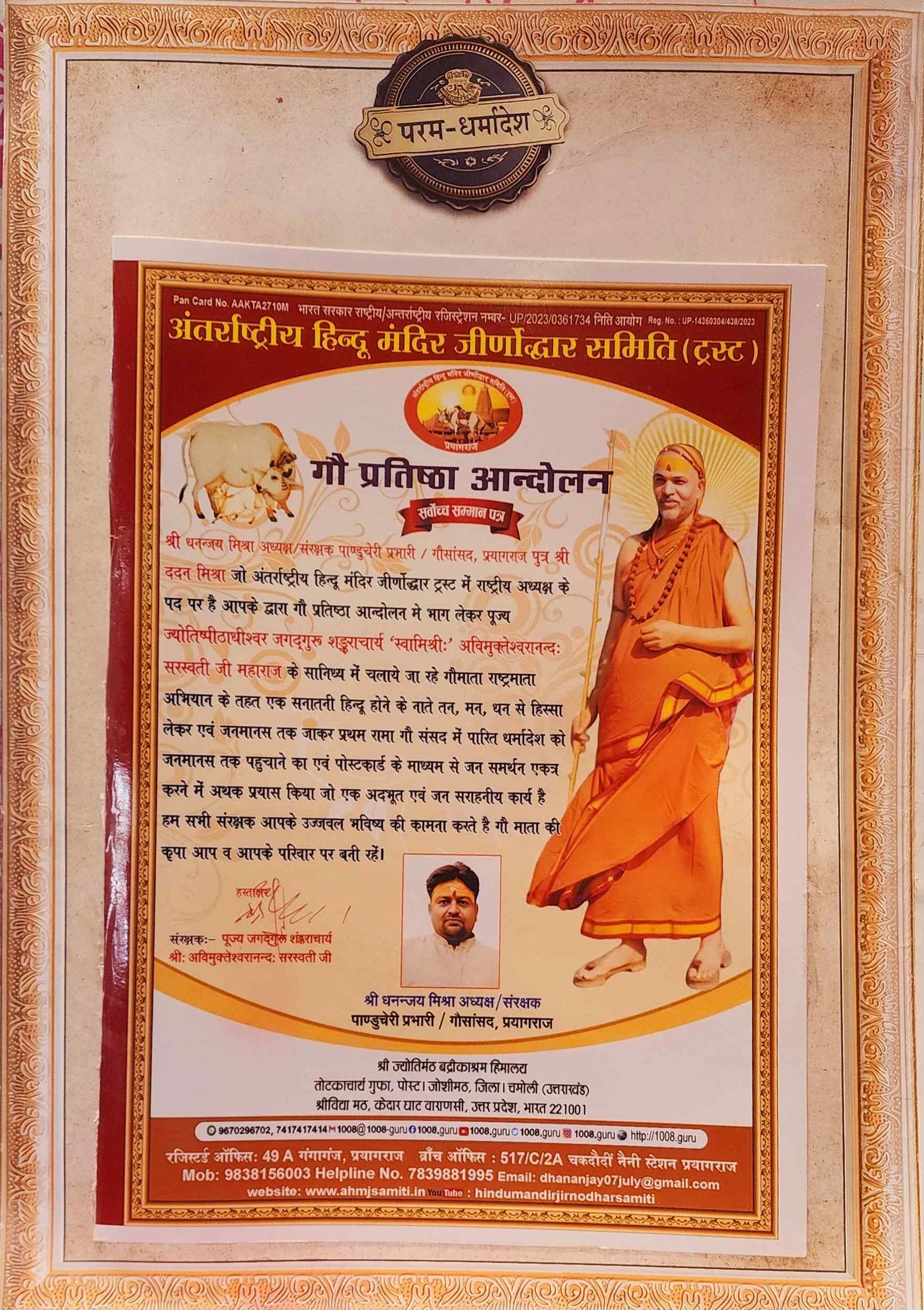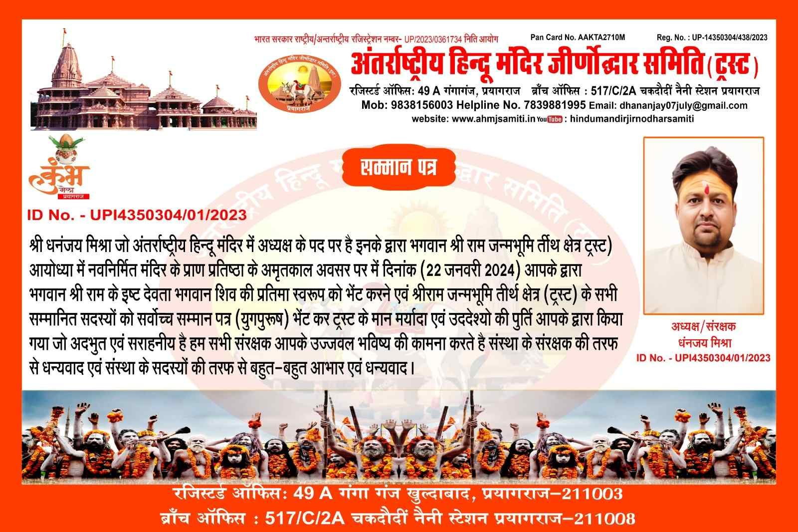 अंतर्राष्ट्रीय हिंदू मंदिर जीणोद्धार समिति में उत्तर प्रदेश मीडिया प्रभारी के रूप में आपका कार्य अत्यंत सराहनीय है संस्था आपके उज्जवल भविष्य की कामना करता है संबद्ध श्री धनंजय मिश्रा राष्ट्रीय अध्यक्ष/ संरक्षक