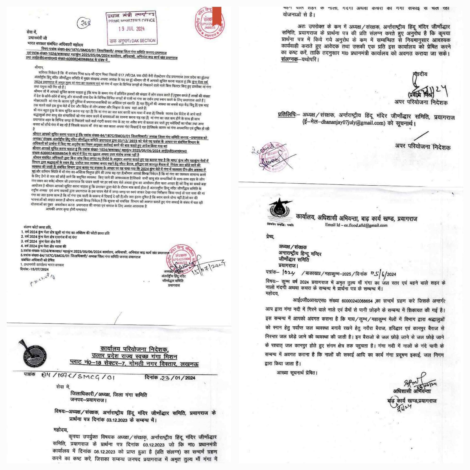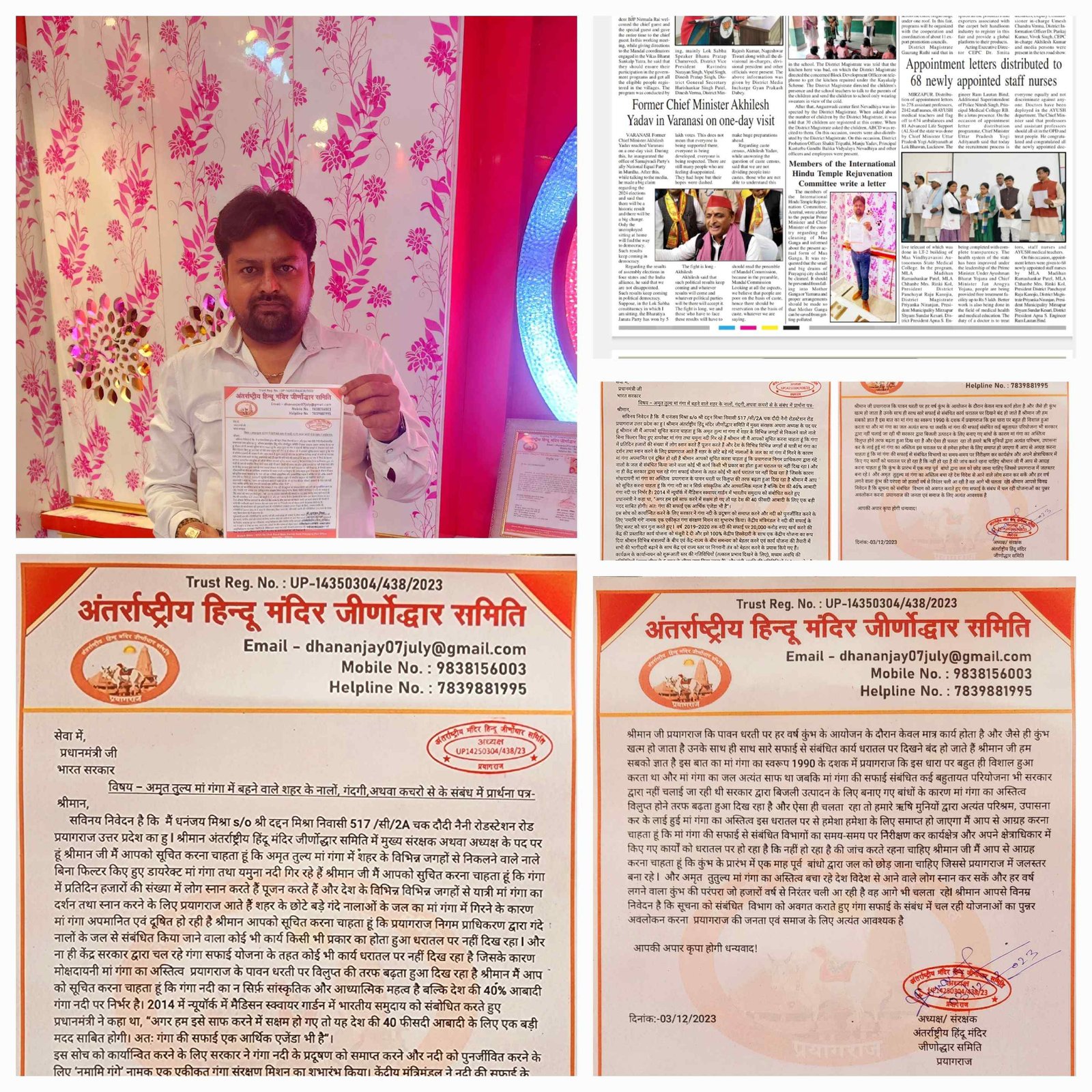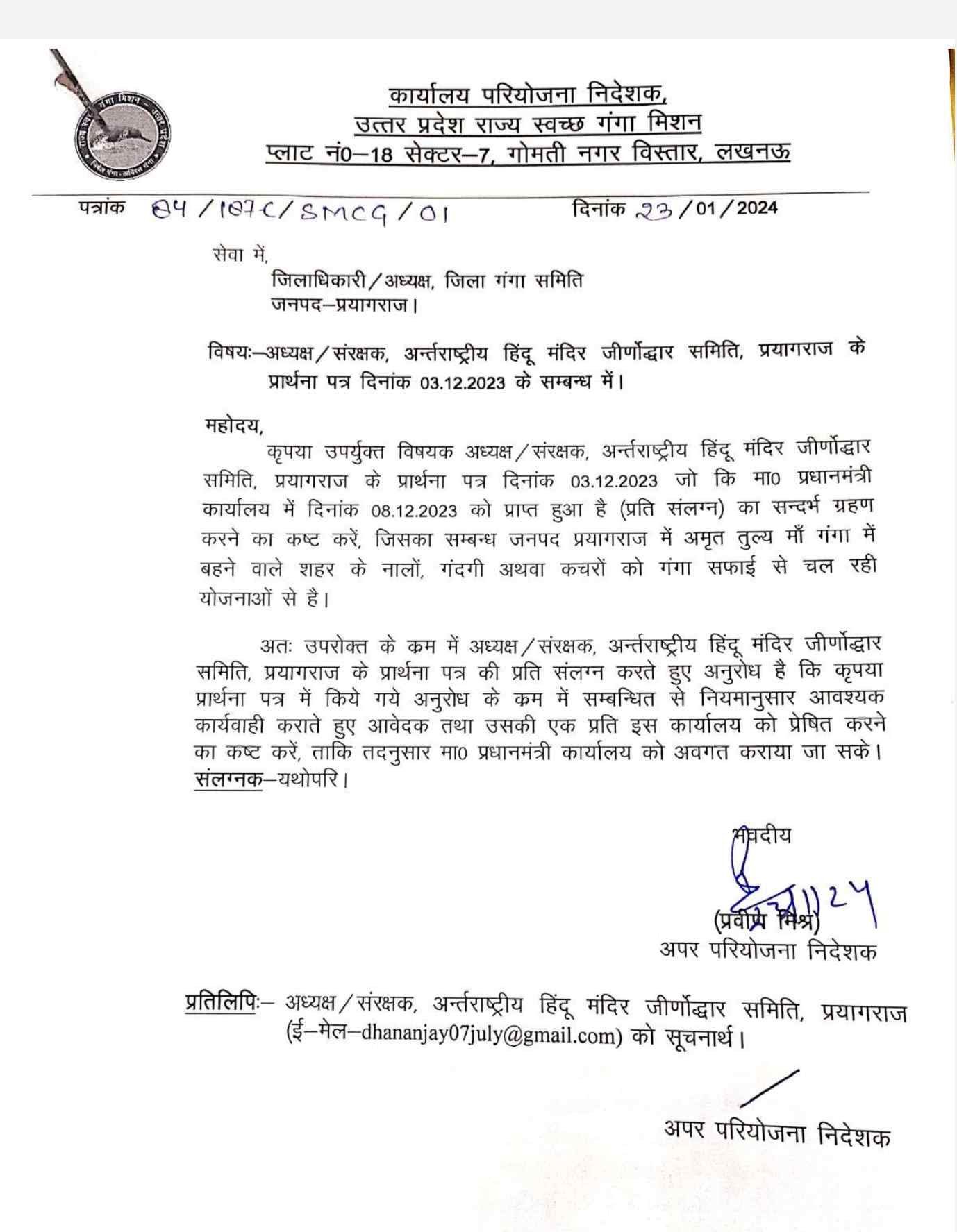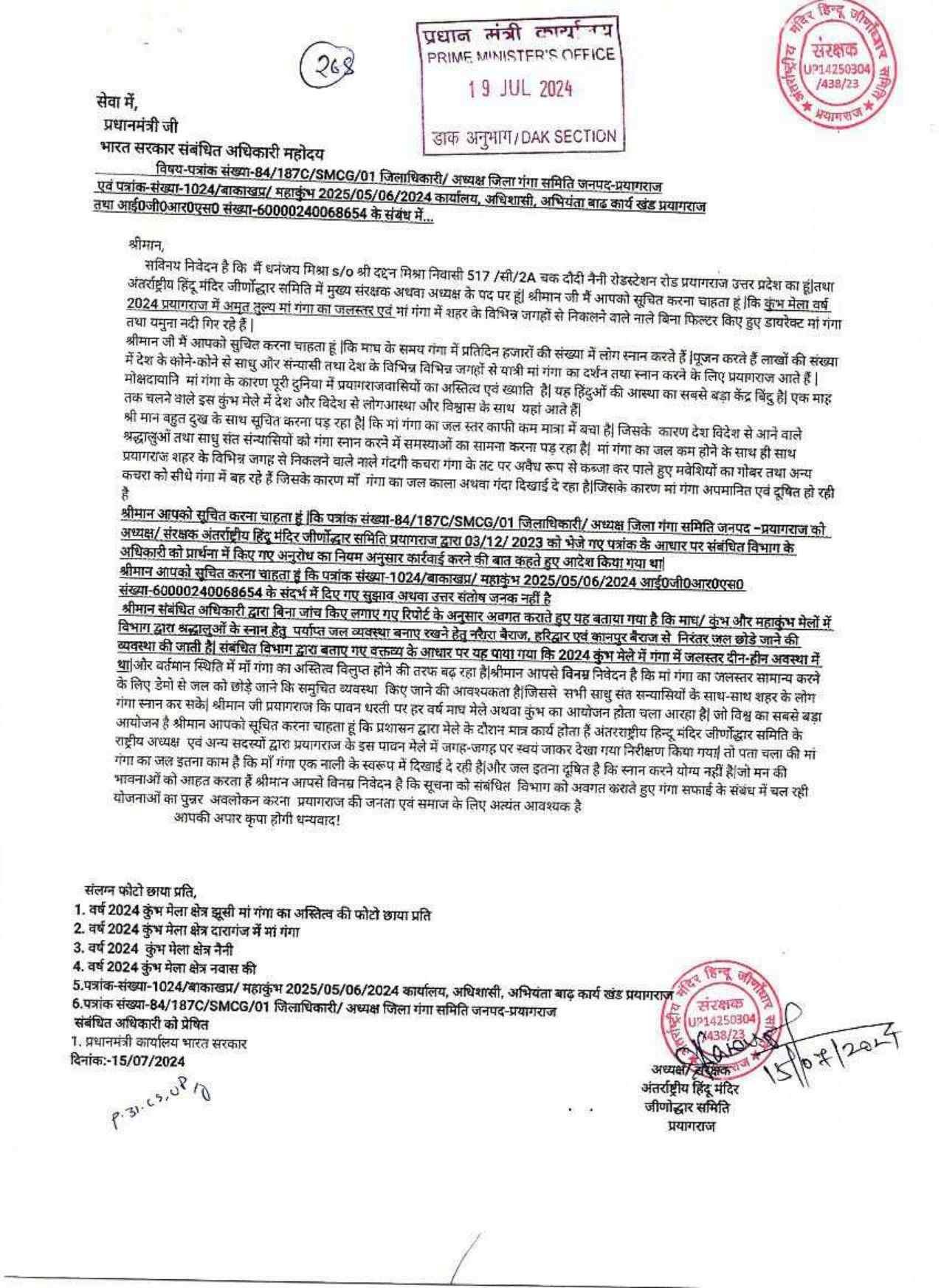 अंतर्राष्ट्रीय हिंदू मंदिर जीर्णोद्धार समिति के राष्ट्रीय अध्यक्ष श्री धनंजय मिश्रा द्वारा मां गंगा सफाई एवं संरक्षण से संबंधित लिखे गये पत्र प्रधानमंत्री जी को मिला मिला और प्रधानमंत्री जी ने तुरंत संबंधित अधिकारी महोदय को कार्रवाई करने के लिए प्रेषित किया