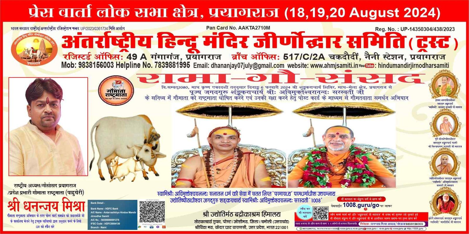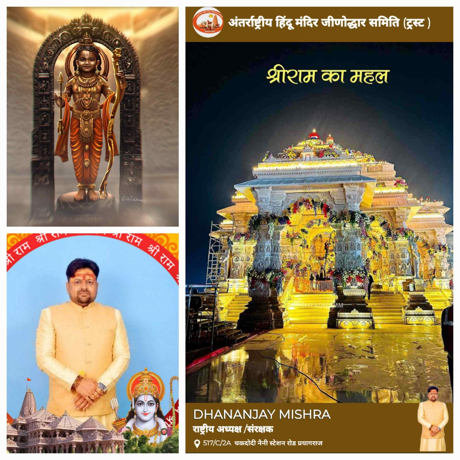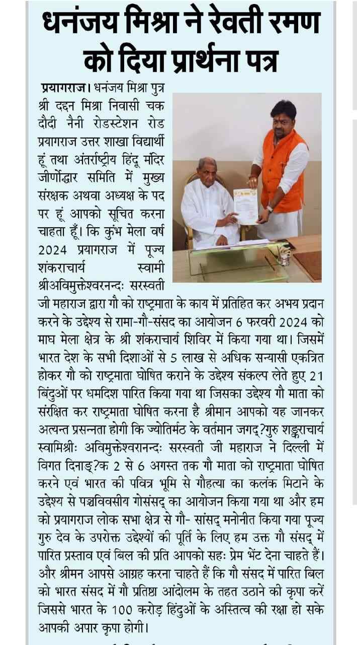 मै धनंजय मिश्रा अंतर्राष्ट्रीय हिंदू मंदिर जीणोद्धार समिति का प्रमुख संरक्षण एवं राष्ट्रीय अध्यक्ष होने के नाते अपनी संस्था के समस्त सदस्यों एवं पदाधिकारी के साथ-साथ समाज उन सभी लोगों से मेरा यह अपील है कि हम सभी को मिलकर तन मन धन के साथ अपनी सनातन संस्कृति एवं धर्म की रक्षा साथ साथ अपने गुरुकुल परंपरा ऋषि, मुनियों की संस्कृति तथा अपनी वैदिक परम्परा साथ ही साथ धार्मिक धरोहरों को भी एकत्रित करते हुए बचाना है धार्मिक धरोहर के रूप में अनेक ऐसे मंदिर हैं जो अति प्राचीन है जो हमारे पूर्वजो के साथ ही साथ विलुप्त होती जा रही है पृथ्वी पर स्थित अमृततुल्य मां गंगा जिसको रघुवंश के अनेक राजाओं ने कठोर तपस्या करके समाज कल्याण के लिए स्वर्ग लोक से पृथ्वी पर अवतरित किया लेकिन समय के साथ-साथ मानव समाज ने माँ गंगा की महत्तता को काम करता चला जा रहा और आज का मानव के रूप में हम सब केवल अपने स्वार्थ से प्रेरित है जिसके इसके कारण गंगा के साथ-साथ कई नदिया अपने विलुप्त अवस्था की तरफ बढ़ रही है जिसका संरक्षण हम सब के मिलकर ही संभव है हमारे देश की सरकारी अपने लाभ के अनुसार मां गंगा के सफाई से संबंधित कार्य करती है आज यह हालत हो गई है कि मां गंगा एक नाले के स्वरूप प्रयागराज में जल प्रवाह हो रहा है आज हम सब मिलकर सामने नहीं आए तो कालांतर माँ गंगा विलुप्त हो जाएंगी मेरे प्रिय साथियों इसी प्रकार प्रयागराज में अनेक स्थलों पर मंदिरों की अवस्था है की अति प्राचीन शिव के मंदिर है जो जर जर की अवस्था में पड़े हुए हैं कोई देखने वाला नहीं है जो लोग हैं वह धन के अभाव में कोई कार्य नहीं कर पा रहे हैं समाज में सनातन धर्म पूजा से संबंध में मुझे भ्रांतियां फैली हुई है जिसके कारण धर्म के ही कुछ लोग मंदिर और मूर्ति पूजा से संबंध में विरोध कर रहे हैं अपने धर्म और सनातन की वास्तविकता को नहीं जानते समाज को जागरूक करने के लिए हमें अपनी पूरी शक्ति के साथ प्रयास करना हैभगवान शिव की आराधना एवं सनातन की आत्मा रूपी धरोहर मंदिर, वेद पुराण, मोक्षदायिनी मां गंगा को बचाने के लिए हमें अपने पूरे शक्तियों लग्न के साथ कार्य करना है मेरे साथियों मुझे पता है संस्था का उद्देश्य इतना आसान अथवा सरल नहीं है शुरुआती समय में लोग अनेक प्रकार की बातें करेंगे हमारे मनोबल को भी तोड़ने का प्रयास करेंगे कहेगे की सारे कार्य संभव है लेकिन हमें पता है कि हम सब मोक्षदायिनी मां गंगा की सेवा अथवा रक्षा के उद्देश्य के लिए प्रतिबद्धित है हम अच्छे से जानते हैं कि भगवान शिव की इच्छा और मां गंगा के आशीर्वाद के बिना कुछ भी संभव नहीं है इस भौतिक संसार मे मानव कल्याण तभी संभव हो सकता है ज़ब गंगा मां अपने स्वरूप में धरती पर विद्यमान रहे हमारी प्राचीन और वैदिक सभ्यता बच