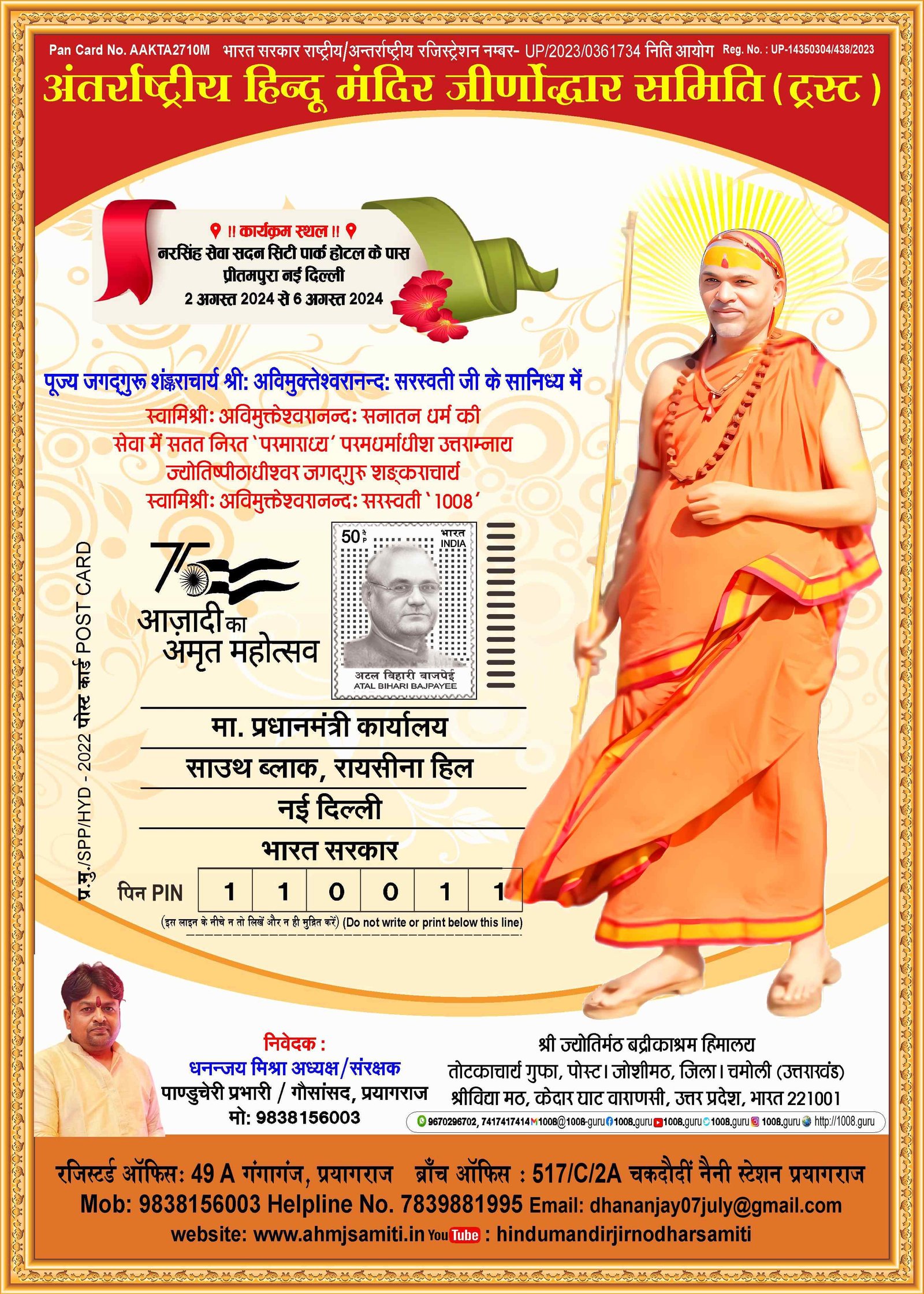 अंतर्राष्ट्रीय हिंदू मंदिर जीर्णोद्धार समिति के राष्ट्रीय अध्यक्ष द्वारा दिए गए पद को श्री रवि जायसवाल जी द्वारा बहुत ही निष्ठा एवं लगन और ईमानदारी के साथ अपने अपने पूर्ण कर्तव्यों के साथ गुरु एवं महादेव की सेवा में लगे हुए हैं महादेव उनके सारे मनोकामना को पूर्ण कर आशीष प्रदान करें संबद्ध श्री धनंजय मिश्रा राष्ट्रीय अध्यक्ष/ संरक्षक